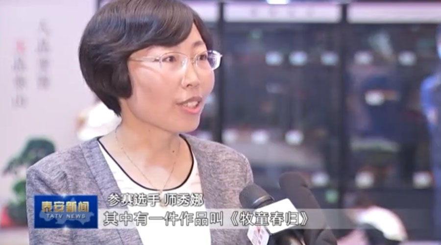 遇石记《牧童春归》等七件泰山玉雕作品参加本届展会,遇石记总经理师秀娜女士接受了媒体采访。
